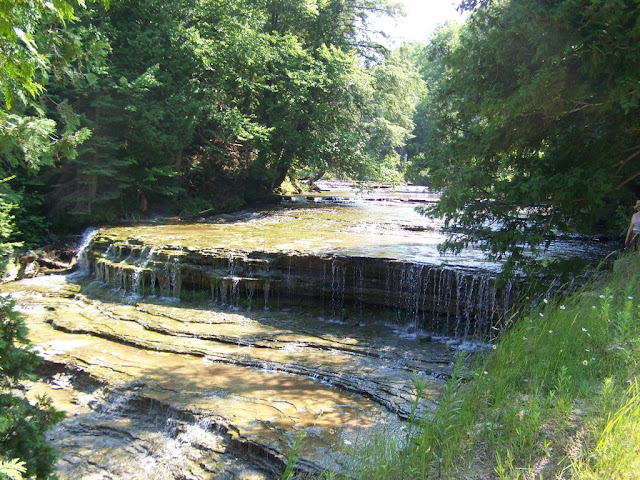 Depending on the time of year you show up to view the falls, the falls will look different. I’ve posted pictures from two different visits, the first in May 2009, the second in July 2008. There was obviously more water in May 2009 right after the snow had melted. Interestingly, the cool color of the bedrock is not as visible during periods of higher flow, but is better at low flow. The bedrock has a yellowish-brown hue to it.