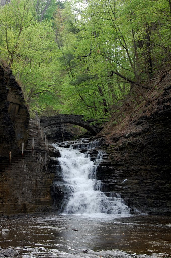 Of the three waterfalls I saw in the Cascadilla Gorge, the third waterfall in was my favorite. The bridge crossing over the river is very picturesque and scenic, and just added to the beauty of the waterfall. The waterfall itself is not that tall, though it is still very enjoyable. If you look on the left side of the picture, you’ll notice the trail that leads up the gorge, and that trail passes directly next to the falls. The trail past this point looked a little less safe, which is likely why the gorge was closed in early May.