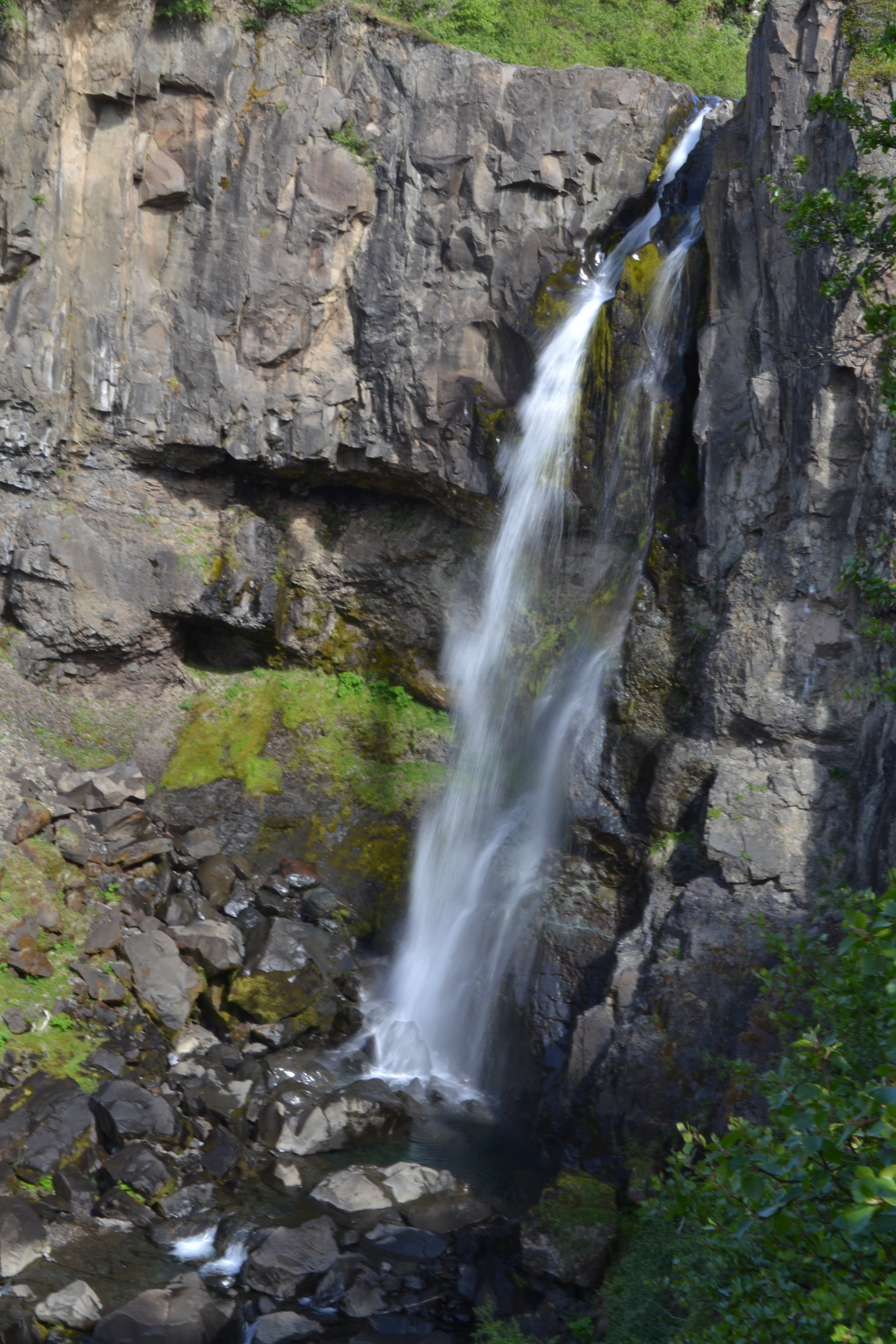 There are at least three easily visible waterfalls along this trail (Hundafoss, Magnúsarfoss, and Svartifoss), though I believe I’ve seen a fourth falls on other sites. I’m not sure where the fourth is, and I didn’t spend any time searching. The first waterfall you come across along the trail is Hundafoss. It’s more impressive than one might imagine. There is an “official” viewpoint for the falls near the crest, and that view is not particularly impressive. But if you pay attention as you’re hiking uphill, you’ll suddenly hear water flowing, and if you look to your left, you might notice a rather well-worn detour trail that very quickly leads to a pretty impressive view of the falls. You do have to duck under a few trees, but it’s well worth it.