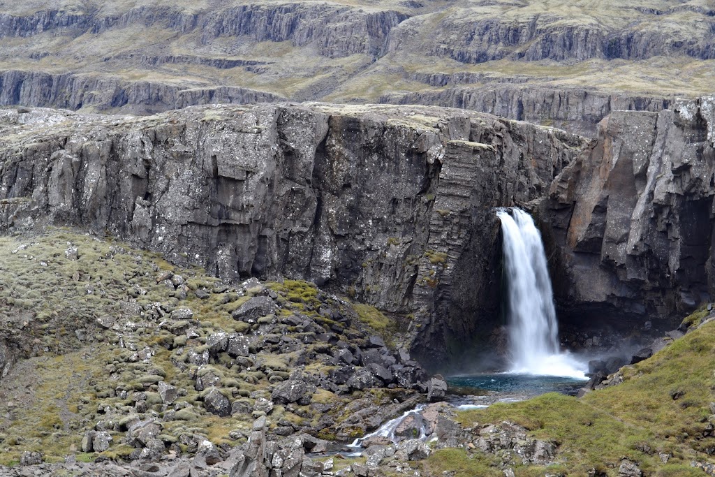 Most of the Ring Road around Iceland is paved, but there are a few still unpaved stretches remaining. There are a few points where it is completely unavoidable. You will be on an unpaved road, whether you like it or not. South of Egilsstaðir, you’re faced with this choice. Either take the unpaved Ring Road, or take (mostly) unpaved route 939. It turns out that Route 939 is a shorter drive than the Ring Road, since the Ring Road hugs the Atlantic coastline. Route 939 is steep and winding as you’re heading south. There are one or two waterfalls or cascades along the way (Hænubrekkufoss is tall, but a bit further away and harder to pull off for), but nothing as exciting to write home about. And then, out of the corner of your eye, you might notice this much more impressive waterfall. It isn’t advertised very well in guidebooks or even on the internet.