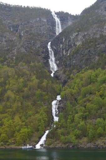 I took two different short 2-3 hour cruises while in Norway. One of them was from Flåm to Gudvangen (or vice versa). It passes through two different smaller fjords, Nærøyfjord and Aurlandsfjord. Each of them has a number of very obvious waterfalls that drop hundreds of feet down into the waters below.