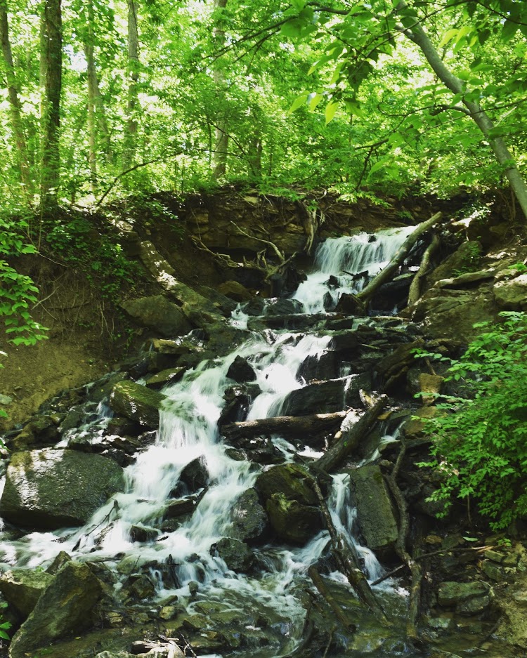 When we arrived at the parking area for the nature sanctuary, it was warm and humid. Luckily, the path was mostly shaded, and the hike is relatively short. It’s just under 1 mile round-trip and is on mostly level ground. Even then, we were still sweating a lot. But once you near the waterfall, it definitely cools down a bit. The waterfall isn’t tall, but it is definitely a beautiful waterfall. It’s a pleasant surprise, one that I would definitely direct people to for a day hike in the Kansas City area.